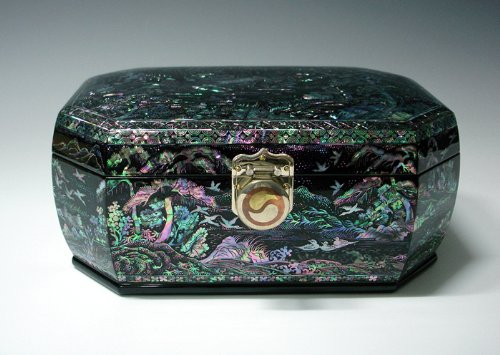 Mother of Pearl Inlaid Landscape Design Lacquered Black Octagonal Luxury Wooden Asian Handcrafted Jewelry Trinket Keepsake Treasure Box Case Chest Organizer Overview